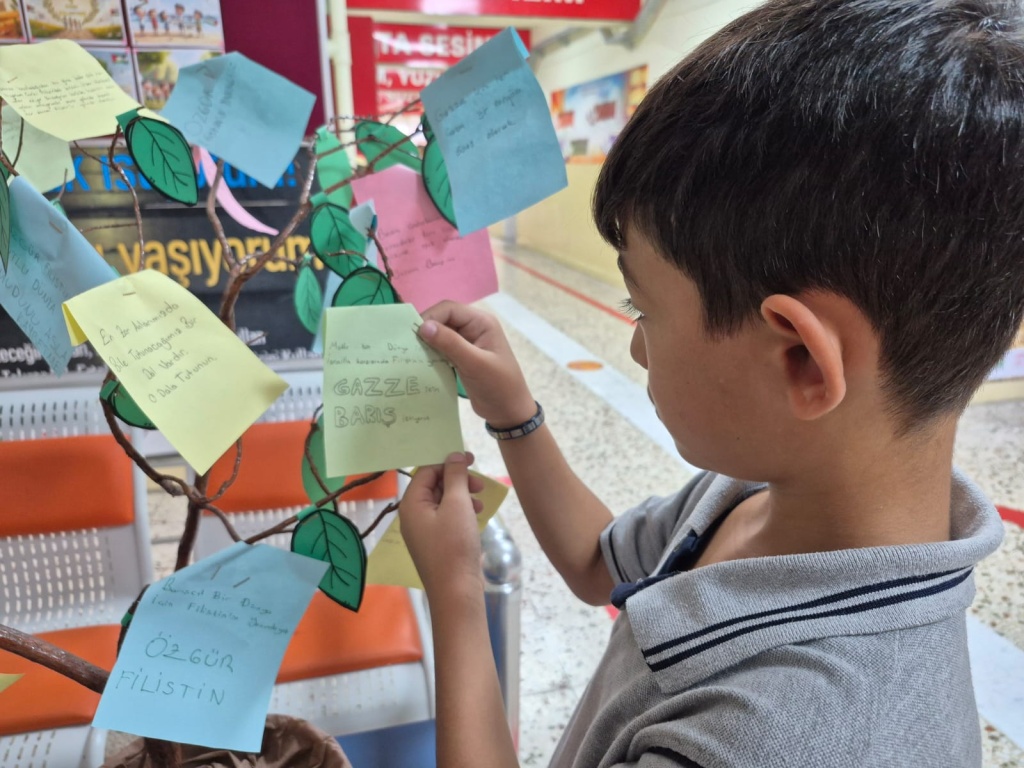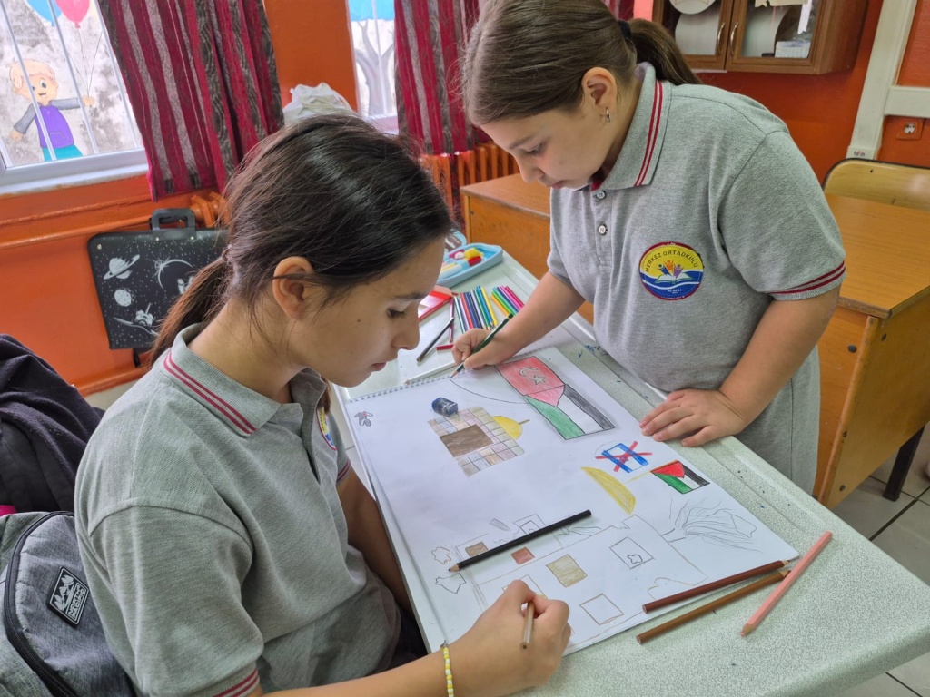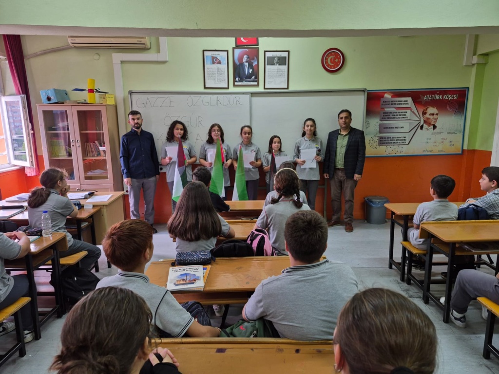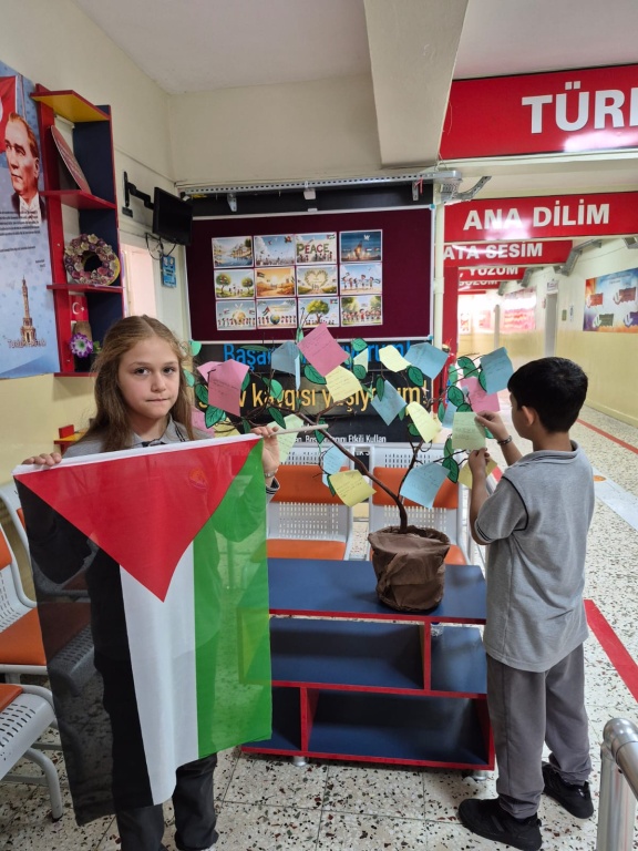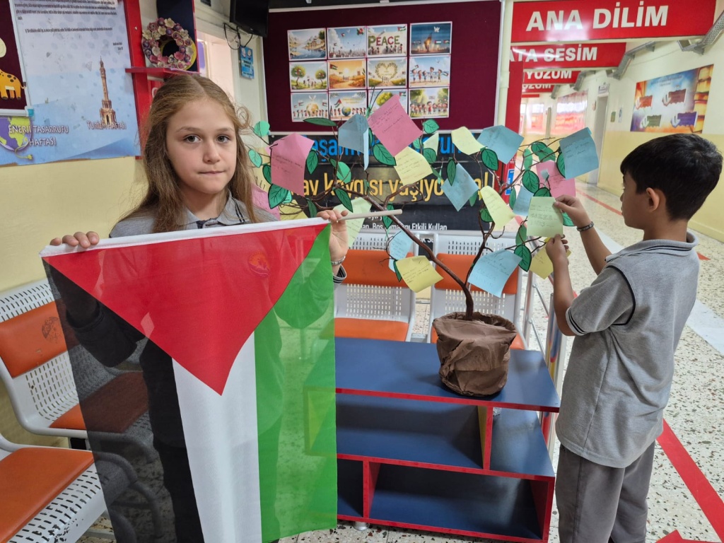 Gönüllerimizde daima “tarihte bugün” öneminde olan “Filistin” halkı ve yaşam başta olmak üzere her türlü haklarından mahrum edilen Gazzeli masum çocuklar için bugün okulumuzda öğrencilerimiz ve öğretmenlerimizle haykırdık: “Yurtta Barış, Dünyada Barış!”