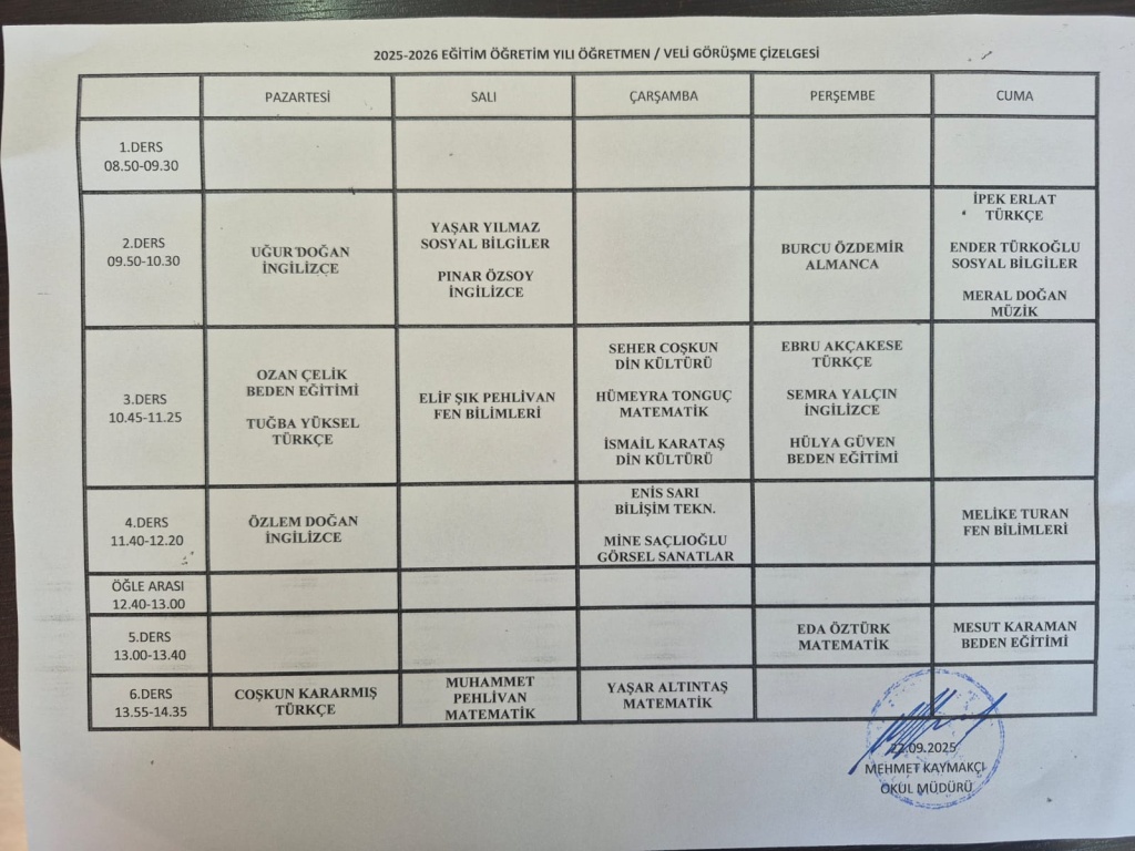 2025-2026 Eğitim Öğretim Yılı Merkez Ortaokulu öğretmenlerimiz ile velilerimiz arasında gerçekleştirilecek görüşmeler; eğitim-öğretim faaliyetlerini aksatmaması amacıyla aşağıdaki gün ve saatlerde olacak şekilde planlanmıştır.